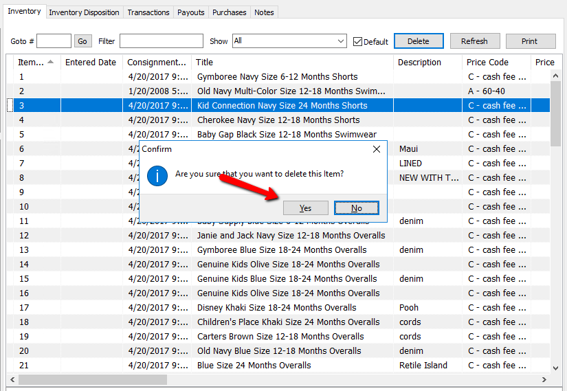 4.A confirmation box will open. Click Yes if you wish to delete the item.