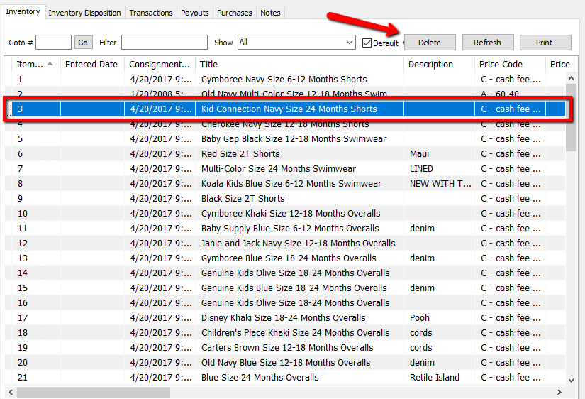 1.While still in the Item Entry screen (before closing out to leave the screen), look for the item to be deleted in the Item Entry Grid. The Item Entry Grid is located in the bottom half of the Item Entry Window.
