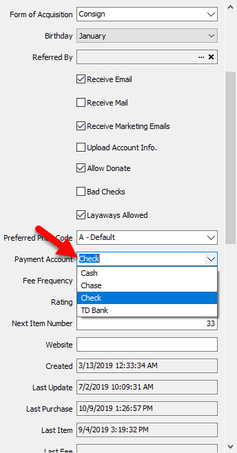 ●Payment Account : Payment account is the default account the consignor will be paid with when being paid for items that have sold. Click the dropdown to change the payment account.
