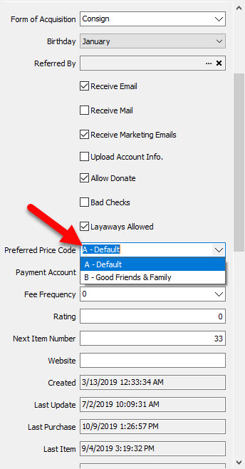 ●Preferred Price Code : This is the default price code items will get when entered into the account. To change the default Price Code, click the dropdown box and select the new price code you wish to be associated with the account.