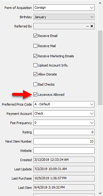 ●Layaways Allowed (Check Box) : Check this box if the customer is allowed to put items on Layaway.