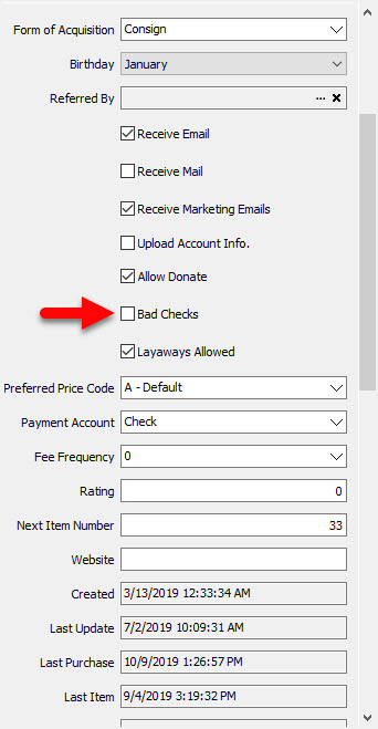 ●Bad Checks (Check Box) : Use this indicator to indicate the customer has issues Bad Checks in the past and is not allowed to use Check as a form of payment.