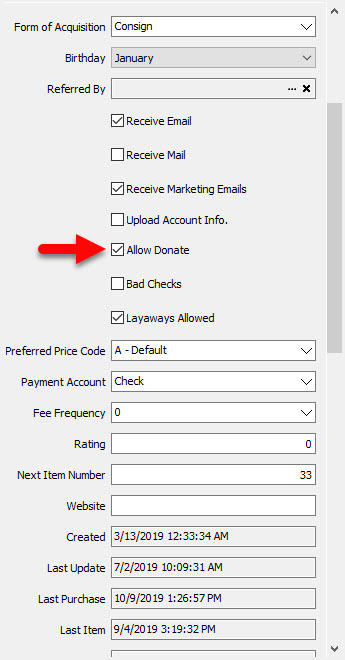 ●Allow Donate (Check Box) : If the customer has indicated that after a specified time period they do not want the items back and are willing to donate them to a charity, check off the Allow Donate Check Box.