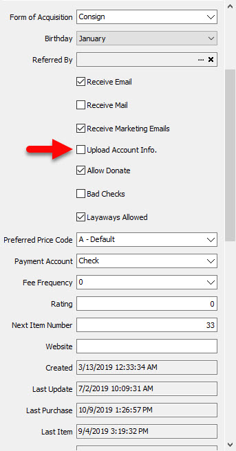 ●Upload Account Info. (Check Box) : Check this box off if customer wishes to be able to check any funds due to them through Consignor Login.