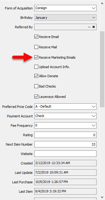 ●Receive Marketing Email (Check Box) : Check this box if the customer has indicated they would like to be contacted with Marketing emails.