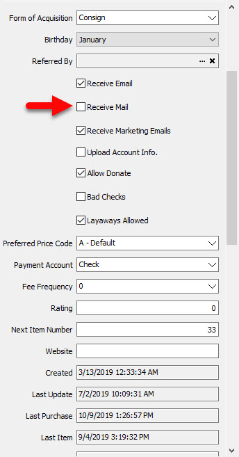●Receive Mail (Check Box) : Check this box if the customer has indicated they like to contacted by Mail.