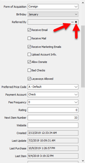 ●Referred By : Click on the browse portion of Referred By to select the account of the person who referred them. Click the X to removed the Referred By details.