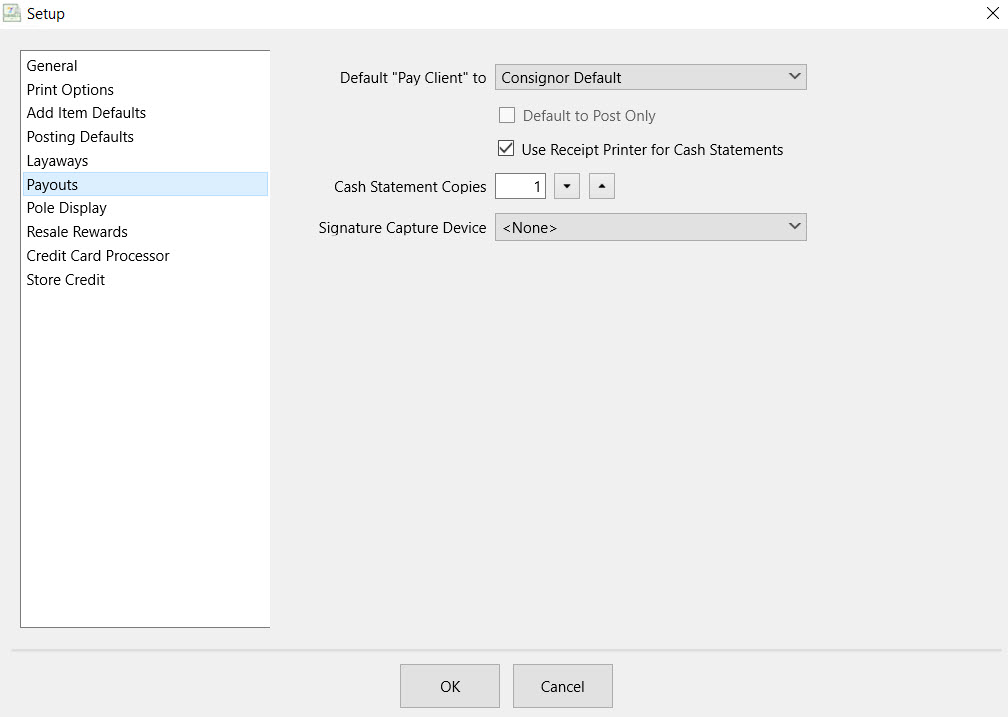 ●Default To Post Only: Sets whether or not you would like to default cash payouts to post only, rather than defaulting to print out a cash statement.