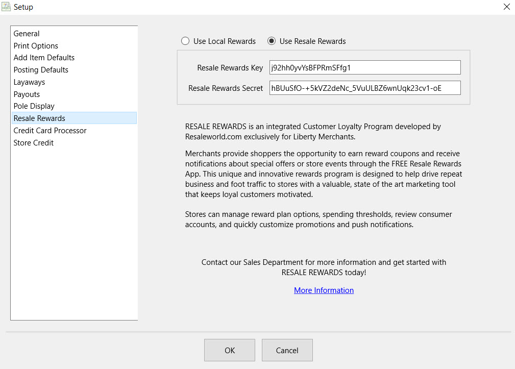 Note: Checking off Use Resale Rewards affects what information the Maintain Rewards Button shows. When checked Maintain Rewards Button will display the different coupon settings for Resale Rewards. When unchecked it will show the rewards plans offered in the Liberty Software. See Choose a Reward Plan System , Resale Rewards Setup and Set Up an In-Store Reward Plan for more information on rewards plans.