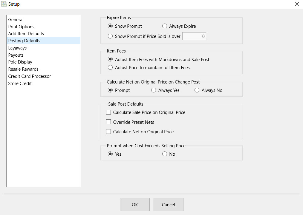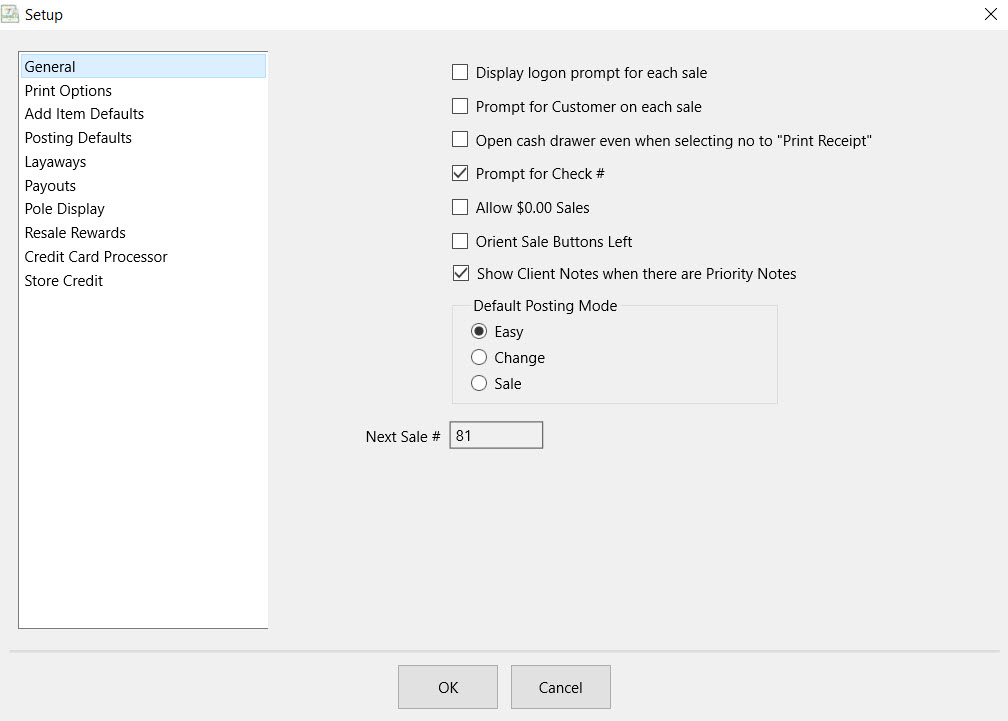 ●Sale Post Default : There are 3 settings to choose from. Checking these boxes set the defaults for the Sale Post when selecting Sale Post from the POS.